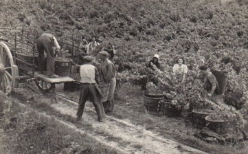 Les exploitations familiales étaient de taille modeste et c’était souvent en famille et avec les voisins que l’on formait l’équipe (la colle). C’était surtout les femmes qui, à l’aide d’une serpette et plus tard d’un sécateur, coupaient les raisins. Les hommes étaient munis de hottes dans lesquelles les vendangeuses vidaient leurs seaux pleins.
